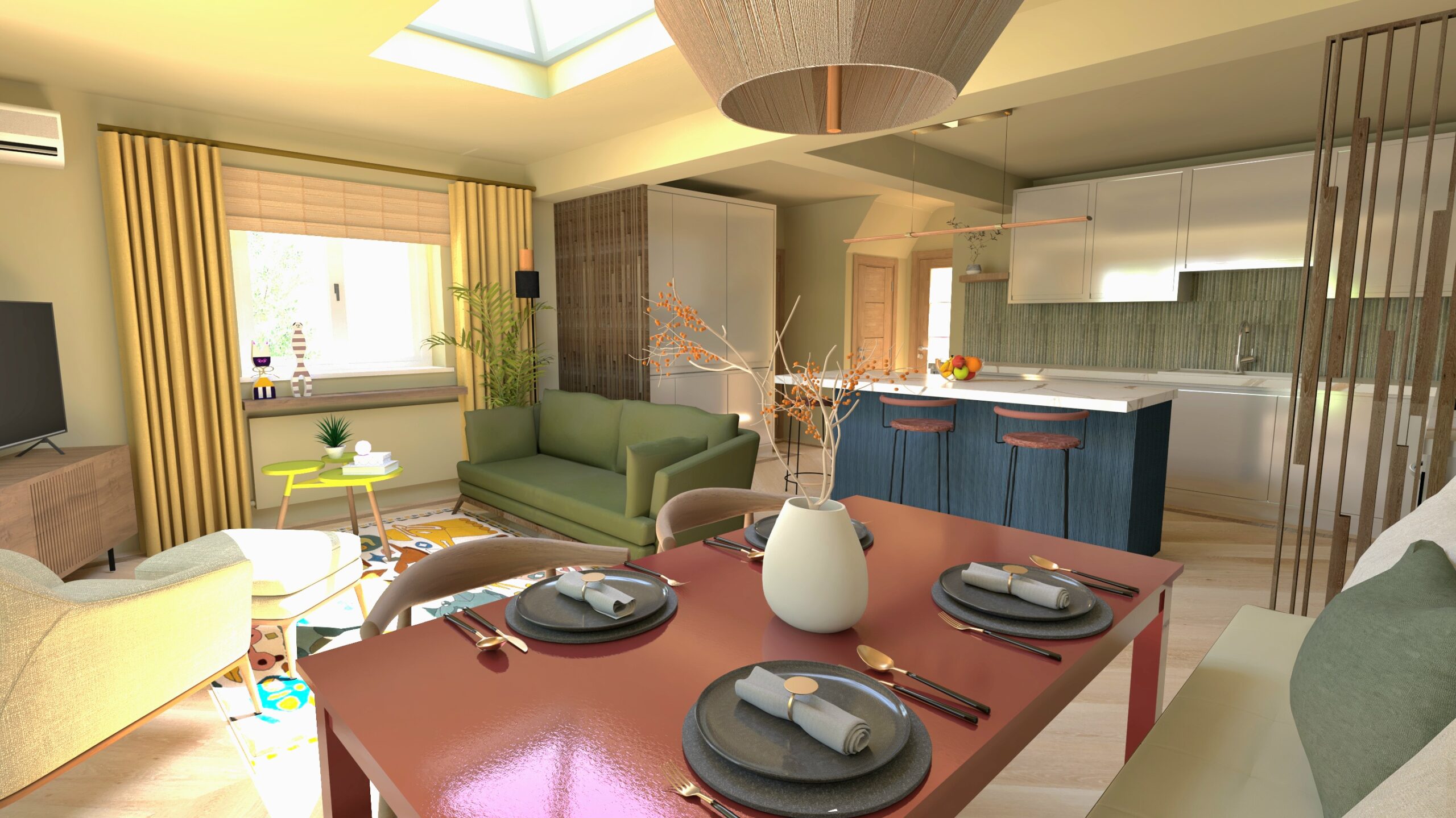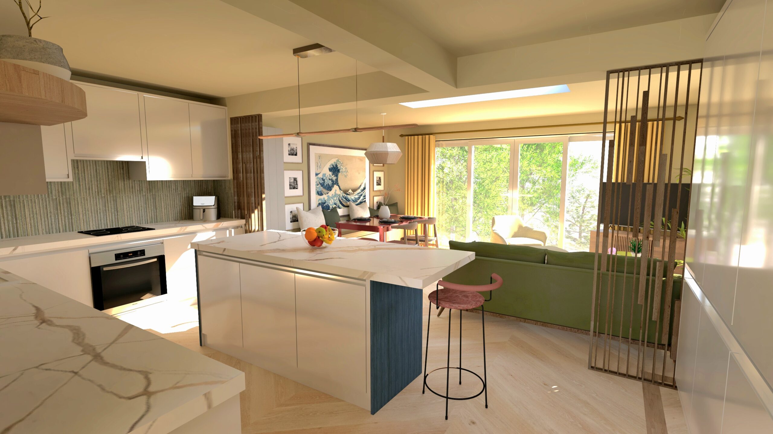 CGI. Japandi Mid-Century Kitchen, Dining & Living Space